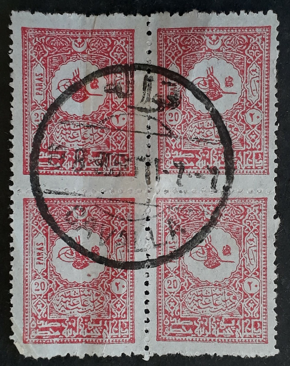 1905 Turkey block 4 x 5Pi red purple Tugra Abdul Hamid II stamps canc Istanbul